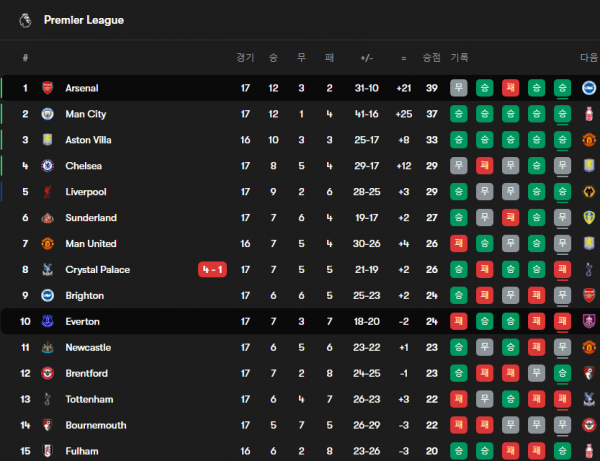 | 순위 | 팀 | 경기 | 승 | 무 | 패 | 승점 |