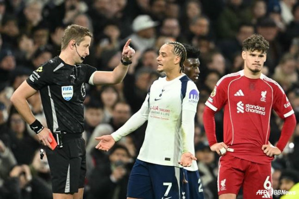 토트넘 홋스퍼와 리버풀의 잉글랜드 프리미어리그(EPL) 경기 전반 중 사비 시몬스(가운데)가 퇴장 명령을 받고 있다. /AFPBBNews=뉴스1