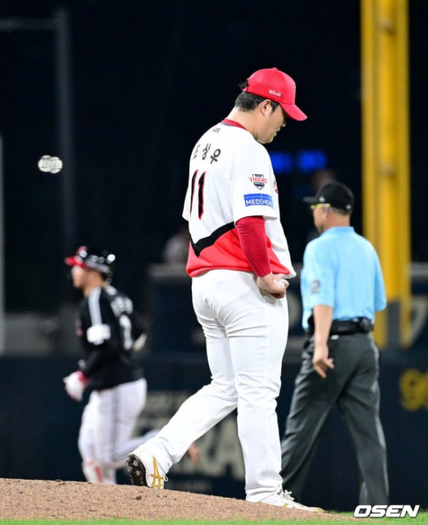 [OSEN=광주, 최규한 기자] 23일 광주-기아 챔피언스필드에서 ‘2025 신한 SOL Bank KBO리그’ KIA 타이거즈와 LG 트윈스의 경기가 열렸다.홈팀 KIA는 김도현, 방문팀 LG는 요니 치리노스를 선발로 내세웠다.연장 10회초 무사 1루 상황 LG 문보경에게 좌월 투런포를 내준 KIA 투수 조상우가 아쉬워하고 있다. 2025.07.23 / [email protected]