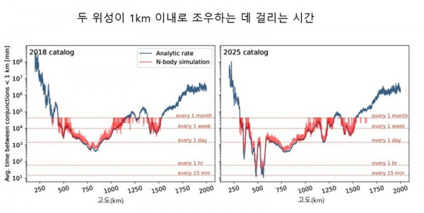 연구진이 현재의 위성 수를 기준으로 시뮬레이션한 결과, 어떤 이유로 충돌 회피 기동이 없을 경우 저궤도 전체에서는 22초마다, 스타링크 위성 밀집구역(고도 550km)에서는 11분마다 다른 위성과 1km 이내에서 근접 조우하는 것으로 나타났다. 1km는 현재 위성업체들이 충돌 회피 기동을 실행하는 거리다. 연구진은 “스타링크 위성의 경우 현재 1기당 연평균 41회의 충돌 회피 기동을 하고 있으며, 전체 군집위성으로 확대해서 보면 평균 1.8분에 한 번씩 충돌 회피 기동이 이뤄지고 있다”고 밝혔다. 연구진에 따르면 그동안 스타링크의 충돌 회피 기동 횟수는 6개월마다 2배씩 증가했다.