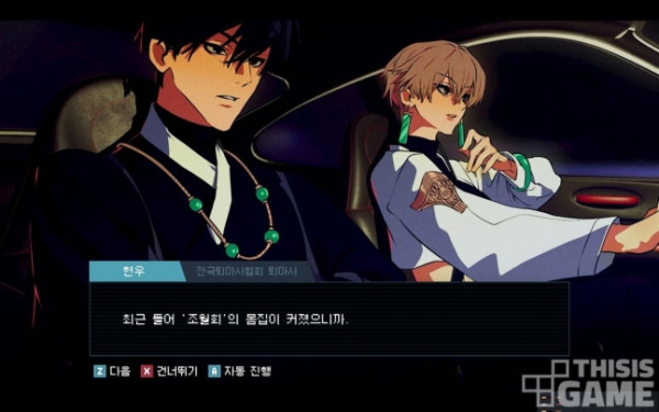 ▲ 스팀 페이지의 시놉시스에도 있는 '전국퇴마사협회'와 악의 조직 '조월회' 사이의 이야기가 큰 맥락으로 등장한다. 퇴마사협회의 선배격으로 등장하는 현우와 지원의 매력이 상당하다.