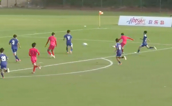 대한민국 U-15 대표팀 정우진 한-일전 골 장면. 중계화면