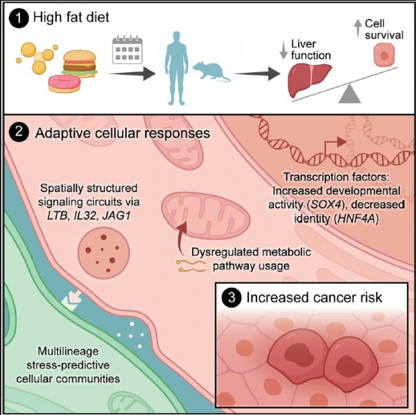 연구팀은 성숙한 간세포는 고지방 식단에 반응해 미성숙한 줄기세포 유사 상태로 되돌아간다며 이런 변화는 고지방 식단으로 인한 스트레스 환경에서 세포가 살아남는 데는 도움이 되지만 장기적으로는 암 발생 위험을 높인다고 말했다.