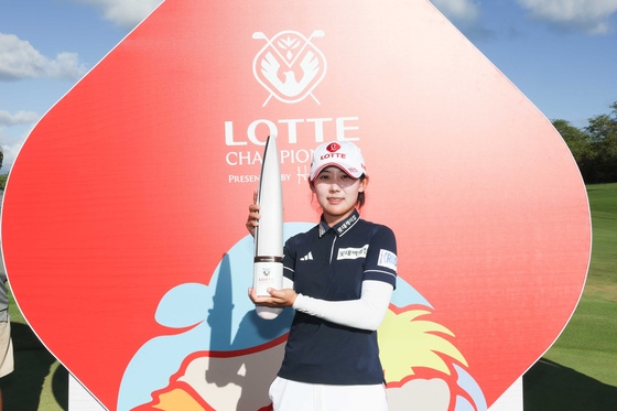 (서울=뉴스1) = 황유민이 4일(현지시간) 하와이 오하우섬 에바비치에 위치한 호아칼레이CC에서 열린 '2025 롯데 챔피언십' 에서 우승 후 트로피를 들어보이고 있다. (대홍기획 제공. 재판매 및 DB 금지) 2025.10.5/뉴스1