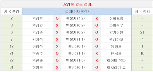 반면 변상일 9단, 안성준 9단, 김지석 9단, 이창석 9단, 허영락 5단은 아쉬운 결과를 받아들었다. 중국은 4명 출전해 3명, 일본과 대만은 각각 2명 출전해 1명씩 승리했다.