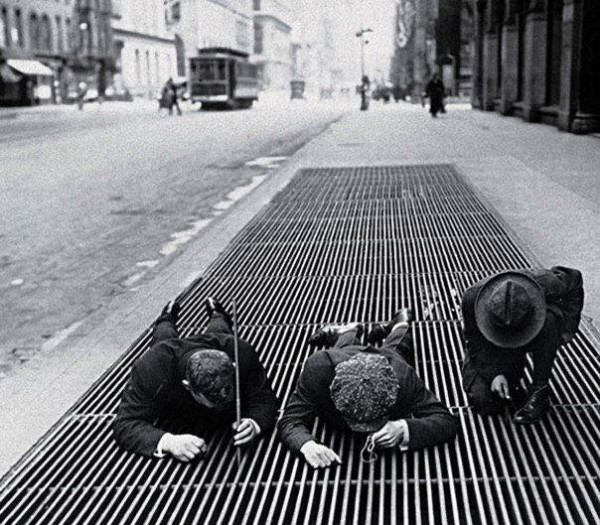1930년 대공황 당시 뉴욕시에서 소년들이 환풍구 덮개에서 작은 동전을 건져 올리고 있다.