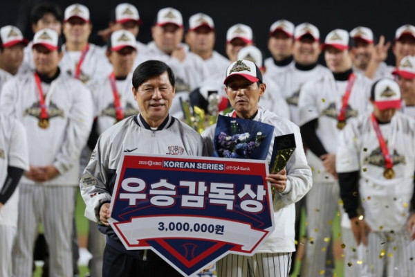 엘지(LG) 트윈스 염경엽 감독이 한국시리즈 우승을 확정한 뒤 허구연 KBO 총재와 함께 기념 촬영을 하는 모습. 연합뉴스