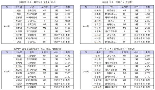 K-스타는 득표수를 기준으로 아포짓 스파이커 2위, 아웃사이드 히터 1, 4위, 세터 2위, 미들 블로커 1, 4위, 리베로 1위를 차지한 선수들이 한 팀을 이뤘다.