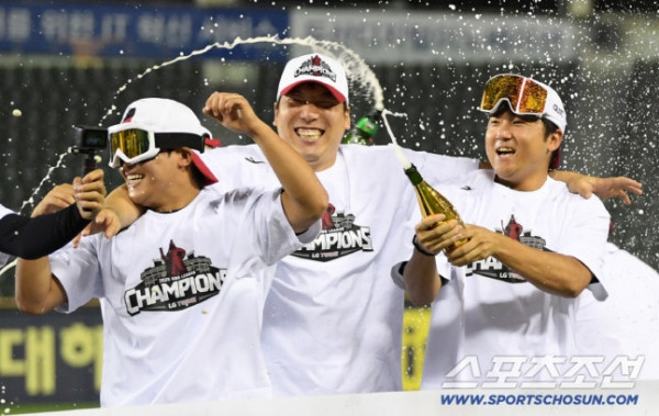 1일 잠실구장에서 정규리그 우승을 확정 지은 LG 트윈스 김현수, 송승기가 기뻐하고 있다. 잠실=박재만 기자 [email protected]/2025.10.01/