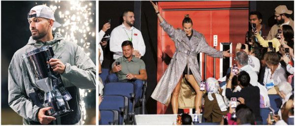 호주의 닉 키리오스(왼쪽 사진)가 29일(한국시간) 아랍에미리트(UAE) 두바이에서 열린 테니스 성 대결에서 승리한 뒤 시상식에서 트로피를 들고 있다. 벨라루스의 아리나 사발렌카가 성 대결에 앞서 관중석에서 팬들에게 인사하고 있다. AP 로이터 연합뉴스