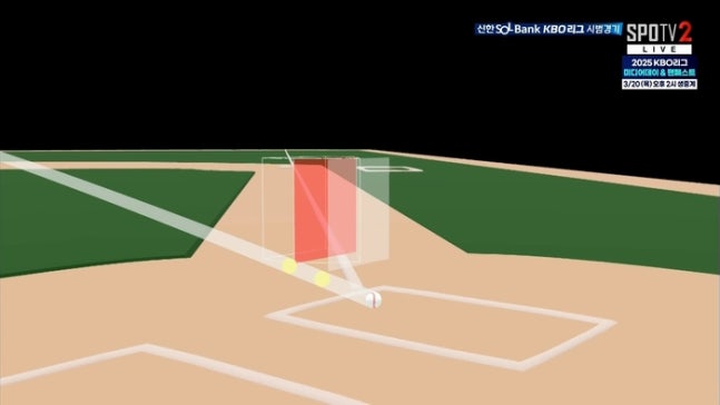 코너 존에 공이 걸쳤다. 스트라이크와 볼 경계에 있는 상황. ABS 판정에 따라 스트라이크가 된 모습. 사진 | 티빙