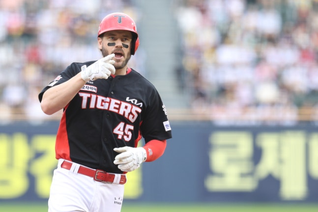 KIA 위즈덤이 13일 잠실구장에서 열린 2025 KBO리그 LG와 경기에서 2회초 좌월 솔로포를 쏘아 올린 후 베이스를 돌고 있다. 사진 | KIA 타이거즈