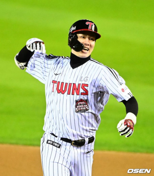 [OSEN=대전, 박준형 기자] 30일 대전 한화생명볼파크에서 2025 신한 SOL Bank KBO리그 포스트시즌 한국시리즈 4차전 한화 이글스와 LG 트윈스의 경기가 열렸다.이날 경기에 한화는 와이스를, LG는 치리노스를 선발투수로 내세웠다. 9회초 무사 1루 LG 박동원이 2점 홈런을 날리고 베이스를 돌고 있다. 2025.10.30 / [email protected]