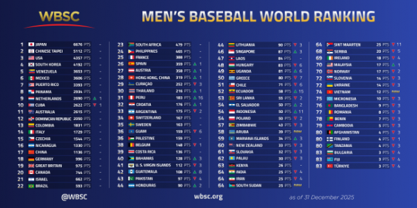 한국 야구 국가대표팀이 2025년 최종 성적표로 세계랭킹 4위를 작성했다. 세계야구소프트볼연맹(WBSC)은 1일(한국 시간) 남자 야구 세계랭킹을 발표하며 “일본이 6676점으로 2025년 세계 랭킹 1위를 차지했으며, 2024 프리미어12 우승국 대만이 5112점으로 2위, 미국이 4357점으로 3위에 올랐다. 한국(4192점)과 베네수엘라(3653점)가 그 뒤를 이었다”고 밝혔다.
