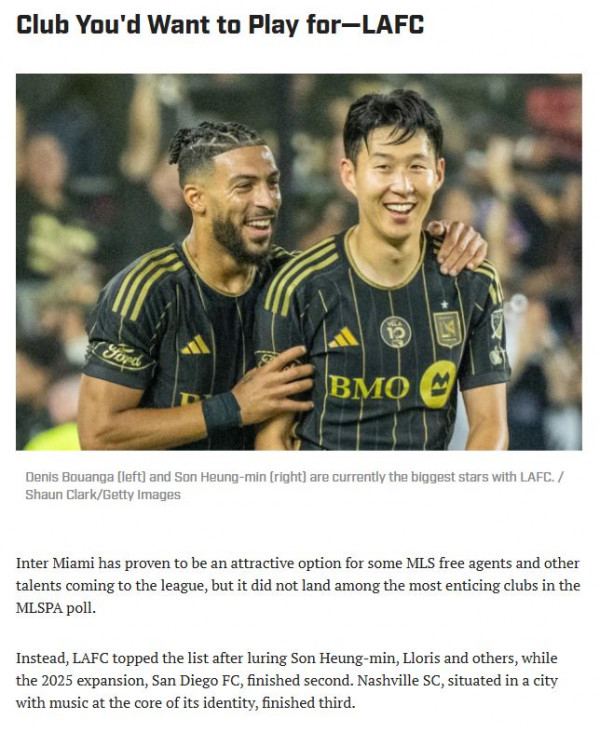 손흥민의 LAFC가 MLS 현역 선수들이 직접 뽑은 가장 뛰고 싶은 팀이라는 상징적인 지표에서 1위를 기록했다.