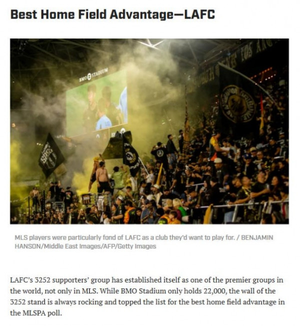 한편, 이번 설문조사에서 LAFC는 '최고의 홈 어드밴티지(Best Home Field Advantage)' 부문에서도 1위를 차지했다.