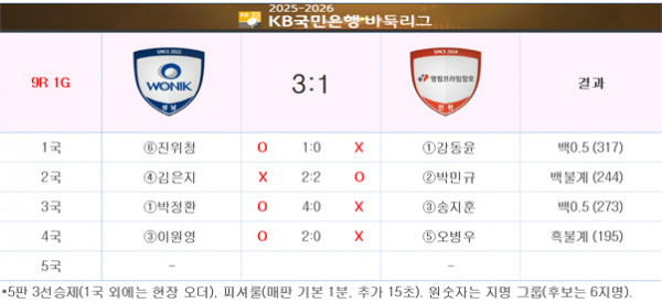 1월 1일 저녁 바둑TV 스튜디오에서 열린 2025-2026 KB국민은행 바둑리그 9라운드 1경기에서 원익은 용병 진위청 9단, 1지명 박정환 9단, 3지명 이원영 9단이 차례로 이기며 박민규 9단의 승리에 그친 영림을 3-1로 눌렀다.