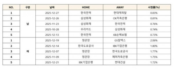 [서울=뉴시스] 진에어 2025~2026 V-리그 상반기(1~3라운드) 남녀부 최고 시청률 톱5 기록. (사진=KOVO 제공) 2026.01.02. *재판매 및 DB 금지