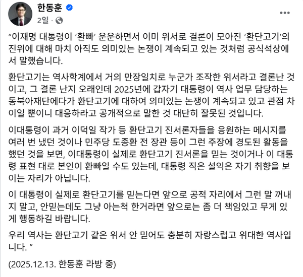 이재명 대통령의 『환단고기』 관련 발언을 두고 국민의힘과 개혁신당 등 보수 야당과 일부에서 이 대통령이 '위서'인 『환단고기』를 '신봉'한다는 식으로 비난을 하고 있다. 과연 정말 『환단고기』는 강단사학계 측의 주장대로 위서가 맞는지 검증을 위해 이번 기사를 기획했다.<편집자 주>