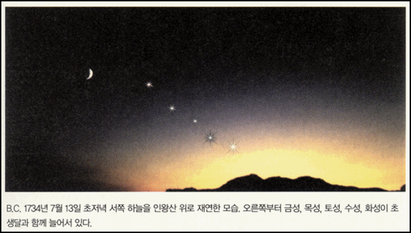 박창범 교수는 이때를 기준으로 전후 약 550년 사이에 5행성 결집이 일어난 시점을 샅샅이 조사했다고 한다. 그 결과 기록 상 연도보다 1년 앞선 기원전 1734년 7월 13일 초저녁에 5행성이 약 10° 이내로 모여 있었던 것이 밝혀졌다.