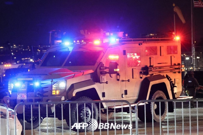 미국의 법 집행 트럭이 3일(한국 시각) 미국 뉴욕의 웨스트 사이드 헬기장에서 니콜라스 마두로 베네수엘라 대통령 부부의 도착을 기다리고 있다. /AFPBBNews=뉴스1