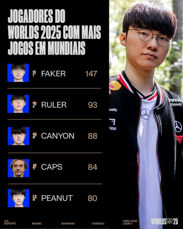 T1 '페이커' 이상혁이 처음으로 리그 오브 레전드 월드 챔피언십(롤드컵)서 150경기(세트 기준) 출전을 눈앞에 두고 있다.