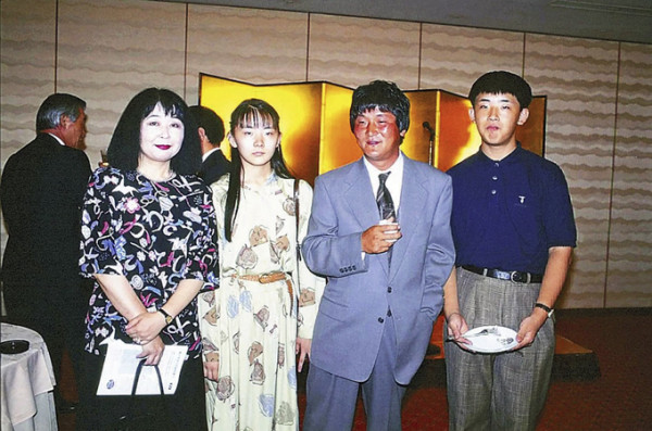 ▲ 1994년 9월 6일, 본인방 취위식에서 아내 교코(왼쪽), 딸 마도카, 아들 구라마와 함께.