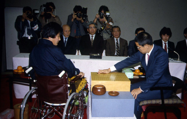 ▲ 전대미문의 휠체어대국. 제10기 기성전 도전7번기 2국에서 도전자 고바야시 고이치 九단이 첫수를 착점하는 장면이다.