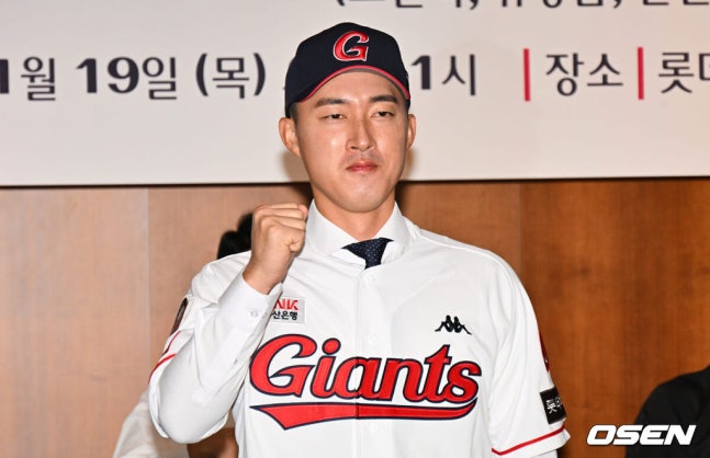 [OSEN=부산, 이석우 기자] 19일 오전 롯데호텔부산에서 롯데 자이언츠 노진혁, 유강남, 한현희의 입단식이 열렸다. 노진혁이 롯데 유니폼을 입고 화이팅을 하고 있다. / [email protected]