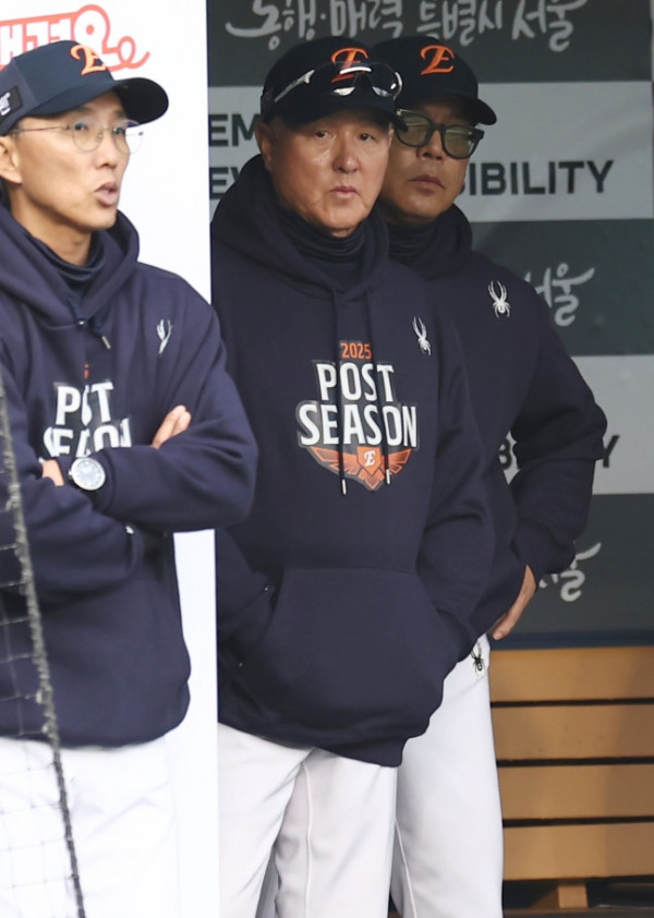 26일 서울 잠실야구장에서 열린 2025 프로야구 한국시리즈 한화 이글스 대 LG 트윈스 1차전 경기. 7회 말 김경문 한화 감독이 LG 박해민의 비디오판독 결과를 기다리고 있다. 2025.10.26 연합뉴스
