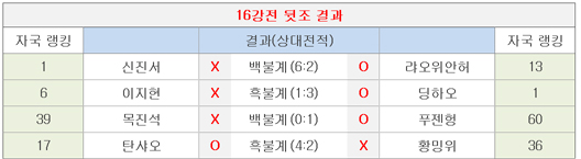중중전으로 치른 16강전에서는 탄샤오 9단이 황밍위 8단을 꺾었다. 32강전과 16강전 첫날 대국에서 기세를 탔던 한국 기사들은 16강전 둘째날에 주춤했다. 한중전 스코어는 한국측 기준으로 32강전 5승 2패, 16강전 3승 3패.