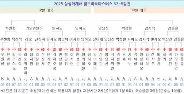 결승까지 휴식일 없이 진행하는 2025 삼성화재배의 상금은 우승 3억원, 준우승 1억원, 4강 5000만원, 8강 2500만원, 16강 1250만원, 32강 500만원이다. 그동안 국가별 우승 횟수는 한국 14회, 중국 13회, 일본 2회.