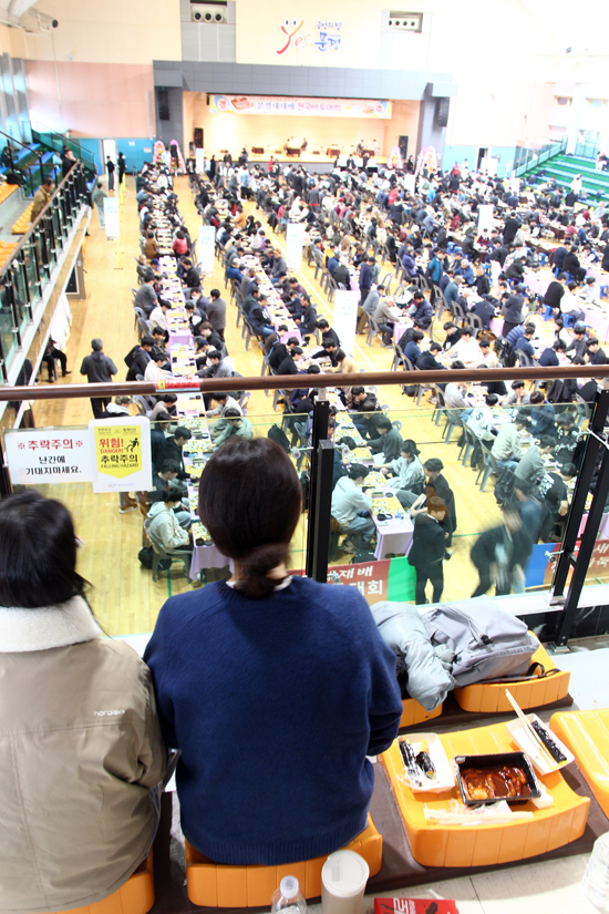 ▲ (작은아이를 대회장에 데려오면서까지) 너는 숙제를 하거라, 이 어미는 (떡을 써는 게 아니라) 큰아이의 바둑을 지켜보겠노라. 이렇게나 인간미 넘쳐나는 바둑대회, 대회장이 문경사람들이 여는 문경새재배이다.