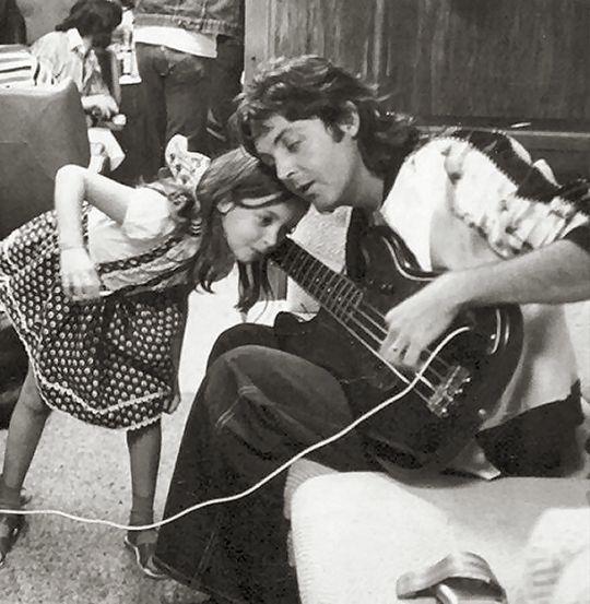 메리 맥카트니가 아버지의 베이스 기타 연주를 듣고 있습니다 — 음악가 가족의 평범한 저녁입니다.