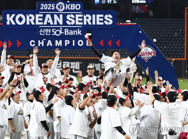 (대전=연합뉴스) 윤동진 기자 = 31일 대전 한화생명 볼파크에서 열린 2025 프로야구 KBO리그 포스트시즌 한국시리즈 시상식에서 통합 우승을 차지한 LG 트윈스 선수들이 주장 박해민을 헹가래 치며 기뻐하고 있다. 2025.10.31 2025.10.31 [email protected]
