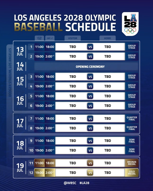 세계야구소프트볼연맹(WBSC)은 12일(이하 현지시각) 발표한 일정에 따르면 2028년 LA 올림픽 야구 경기는 7월 13일부터 19일까지 열린다.