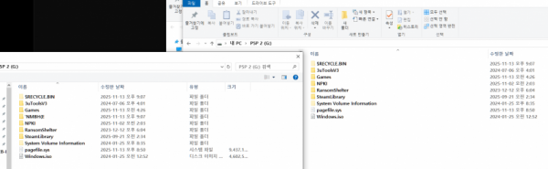 'NMBE(E 폴더가 있죠. 그런데 같은 시점에 제 윈도우 탐색기에서 G: 의 루트폴더를 보면