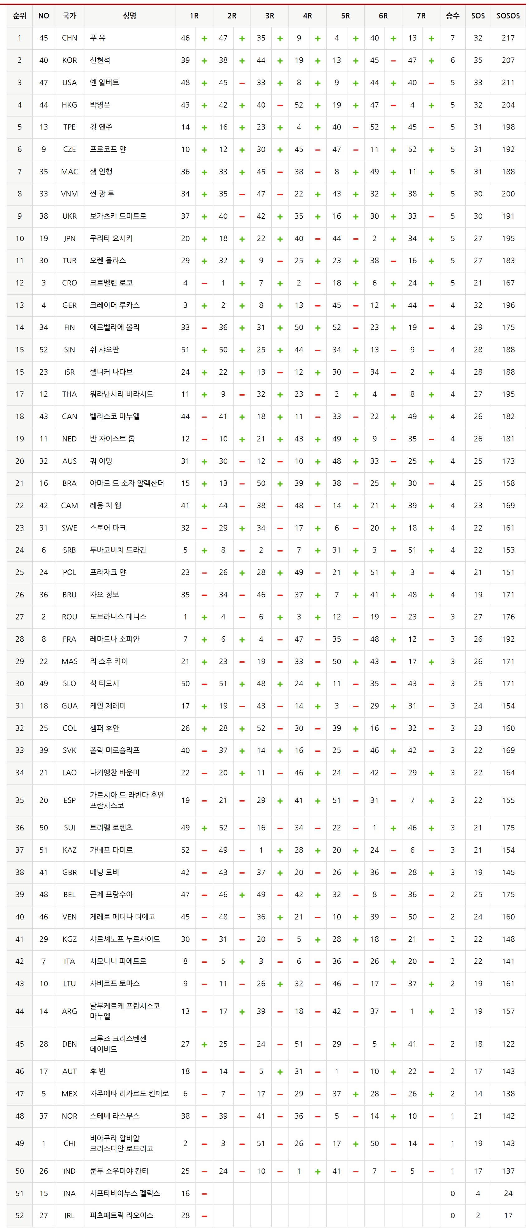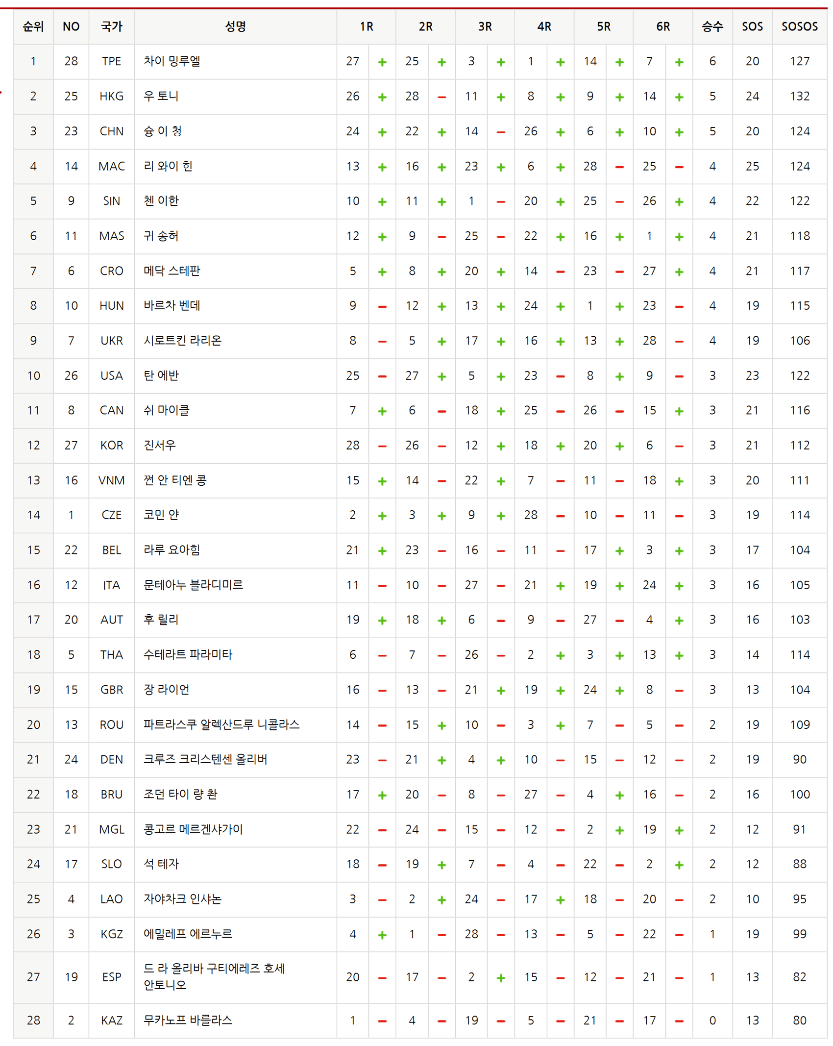 이 밖에 미국 대표 앤 알버트가 3위, 홍콩 대표 박영운이 4위, 대만 대표 청예주가 5위에 자리했다. 유소년 부문은 대만의 차이 밍루엘가 6전 전승으로 우승했고, 한국의 진서우는 12위에 머물렀다.