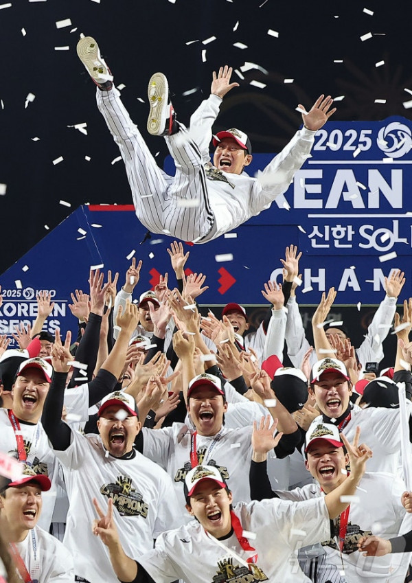31일 대전 한화생명 볼파크에서 열린 2025 신한 SOL뱅크 KBO 한국시리즈(KS·7전 4선승제) 5차전에서 한화 이글스를 4-1로 제압하고 통합 우승을 차지한 LG 염경엽 감독이 선수들에게 헹가레를 받고 있다. 2025.10.31/뉴스1 ⓒ News1 김진환 기자