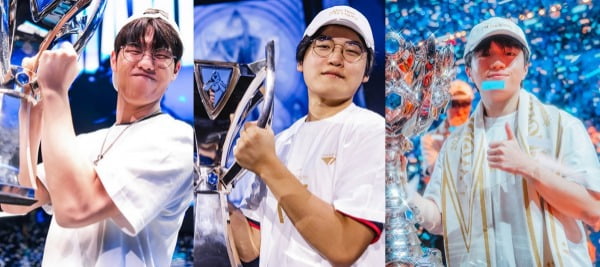 왼쪽부터 T1 '오너' 문현준(2023년 우승 사진), '구마유시' 이민형(2024년 우승 사진), '케리아' 류민석(2025년 우승 사진) / 라이엇게임즈 제공