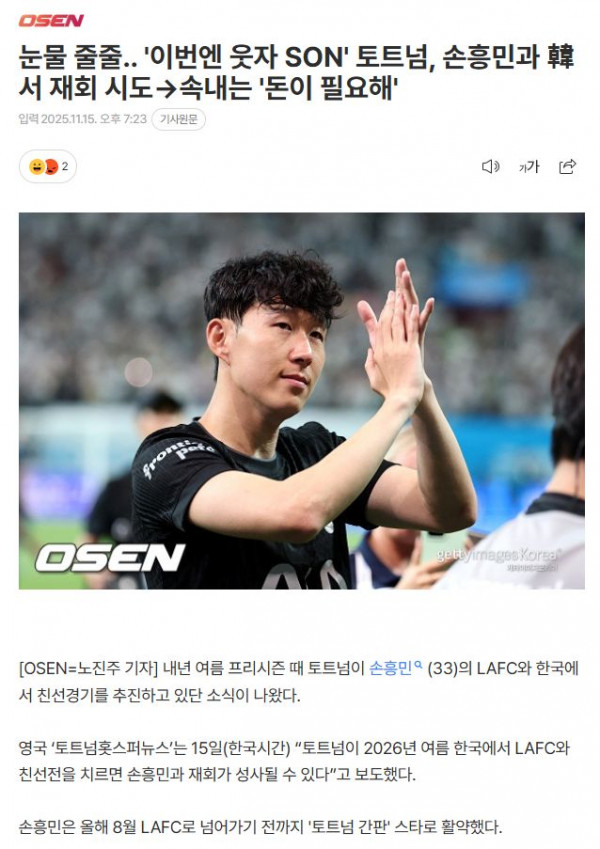 눈물 줄줄.. '이번엔 웃자 SON' 토트넘, 손흥민과 韓서 재회 시도→속내는 '돈이 필요해'