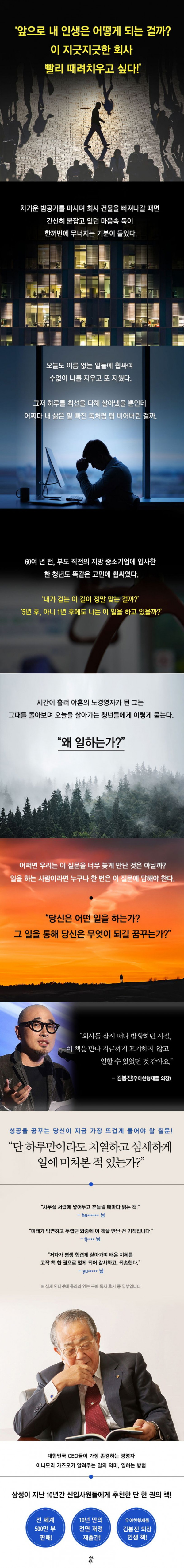 일이라는 화두만으로 아무런 홍보도 없이 수십만 부가 팔린 책이 있다. 2010년 처음 국내에 소개된 이 책은 출간되자마자 우아한형제들 김봉진 의장, LS그룹 구자열 회장 등에 의해 ‘인생 책’이라는 별명이 붙었으며, 유명 CEO들이 사비를 들여 책을 구입해 임직원들에게 선물한다는 소문까지 돌았다. 삼성그룹 계열사의 어느 대표는 10년째 이 책을 신입사원들에게 추천하기도 했다. 대체 어떤 책이길래 이토록 많은 경영자와 직장인들의 가슴에 불을 붙인 걸까?