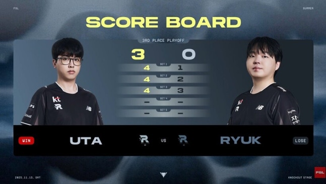 15일 상암 SOOP 콜로세움에서 펼쳐진 2025 FC 온라인 슈퍼 챔피언스 리그(FSL) 서머 3위 결정전, KT 'UTA' 이지환이 KT '류크' 윤창근과 대결에서 세트 스코어 3:0 완승으로 3위를 기록했다.