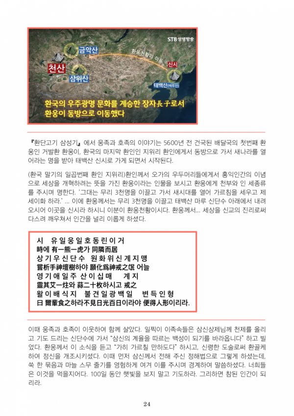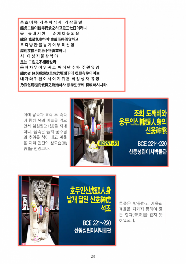 이때 웅족과 호족이 이웃하여 함께 살았다. 일찍이 이족속들은 삼신상제님께 천제를 올리고 기도 드리는 신단수에 가서 “삼신의 계율을 따르는 백성이 되기를 바라옵니다” 하고 빌었다. 환웅께서 이 소식을 듣고 “가히 가르칠 만하도다” 하시고, 신령한 도술로써 환골케 하여 정신을 개조시키셨다. 이때 먼저 삼신께서 전해 주신 정해법으로 그렇게 하셨는데, 쑥 한 묶음과 마늘 스무 줄기를 영험하게 여겨 이를 주시며 경계하여 말씀하셨다. 너희들은 이것??