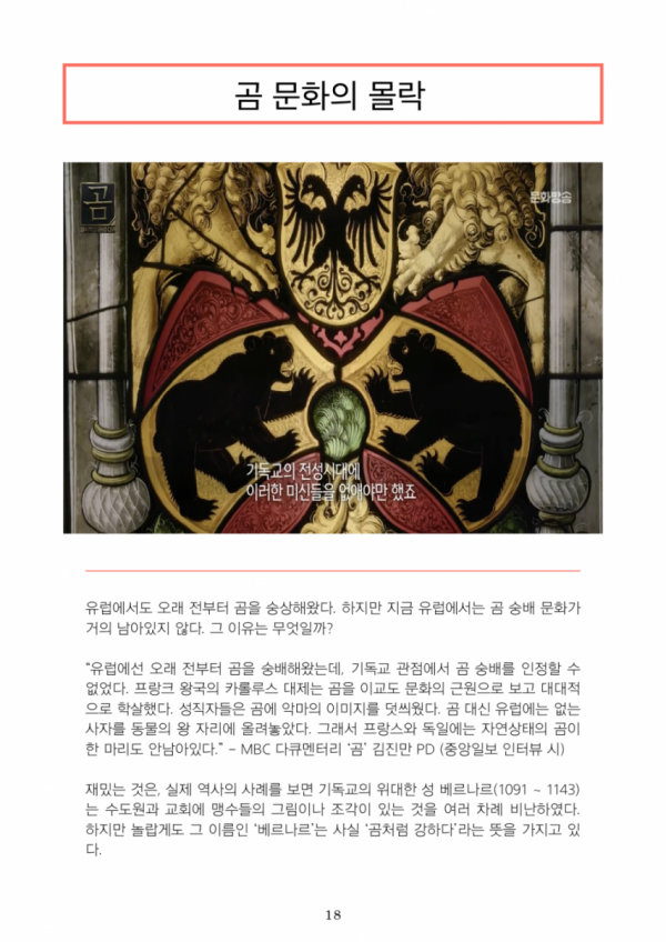 “유럽에선 오래 전부터 곰을 숭배해왔는데, 기독교 관점에서 곰 숭배를 인정할 수 없었다. 프랑크 왕국의 카롤루스 대제는 곰을 이교도 문화의 근원으로 보고 대대적으로 학살했다. 성직자들은 곰에 악마의 이미지를 덧씌웠다. 곰 대신 유럽에는 없는 사자를 동물의 왕 자리에 올려놓았다. 그래서 프랑스와 독일에는 자연상태의 곰이 한 마리도 안남아있다.” - MBC 다큐멘터리 ‘곰’ 김진만 PD (중앙일보 인터뷰 시)