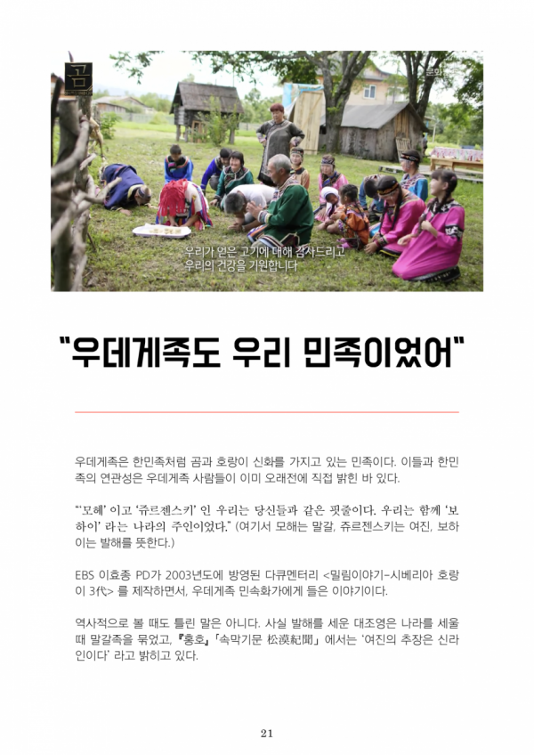 “‘모헤’이고‘쥬르젠스키’인 우리는 당신들과 같은 핏줄이다. 우리는 함께‘보하이’라는 나라의 주인이었다.” (여기서 모해는 말갈, 쥬르젠스키는 여진, 보하이는 발해를 뜻한다.) - EBS 이효종 PD가 2003년도에 방영된 다큐멘터리 <밀림이야기-시베리아 호랑이 3代> 를 제작하면서, 우데게족 민속화가에게 들은 이야기이다.