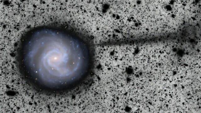 나선 은하에서 검은 색 먼지와 같은 긴 은하의 꼬리가 포착됐다. (출처: