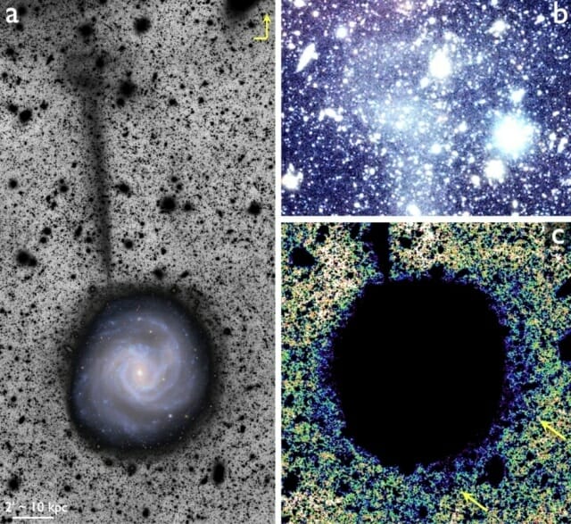 과 그 별의 흐름, b) 흐름 북쪽 끝의 구조를 확대한 모습, c) 은하와 연결되는 흐름을 보여주는 사진 (출처=
