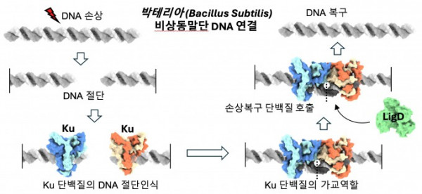 그 결과 Ku 단백질은 단순히 손상 부위를 찾는 데 그치지 않고 DNA의 끊어진 두 끝을 물리적으로 붙잡아 연결하는 '분자 다리' 역할을 했다. DNA 손상 부위가 특정 형태로 배열됐을 때만 작동하는 정밀한 조절 장치도 함께 확인됐다. 이는 포유류에서는 관찰되지 않는 세균만의 독특한 생존 전략이다.