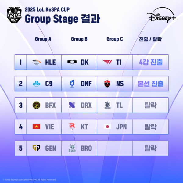 KeSPA컵 그룹 스테이지가 종료됐다. 한화생명e스포츠와 디플러스 기아, T1이 4강에 진출했다.